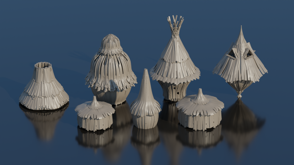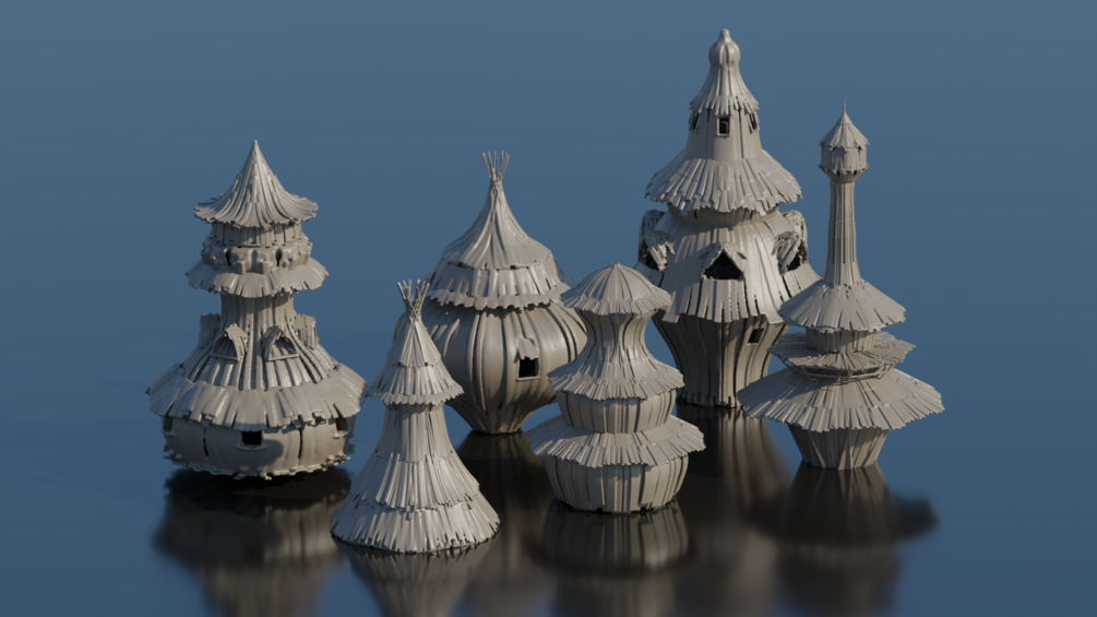 Small collection of wood village huts sculpted in Substance Modeler.